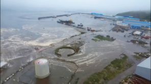 Волной затопило местный завод по производству рыбы, людей успели экстренно эвакуировать с предприятия, под водой полностью скрылся порт. На фото: волной цунами местами затоплены порт, город Северо-Курильск и рыбопромышленное предприятие «Алаид». Население эвакуировано.