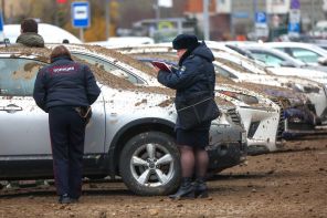 На фото: сотрудники полиции у автомобиля, получившего повреждения в результате обрушения части колонны при демонтаже конструкций на территории горнолыжного комплекса «Снежком».
