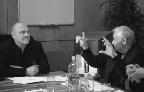 На фото: кинорежиссеры Владимир Наумов (справа) и Владимир Меньшов (слева) — члены комиссии Национальной академии кинематографических искусств и наук по выдвижению на премию «Оскар» — на заседании в киностудии «Мосфильм». Заседание должно определить российскую картину-претендента на соискание премии «Оскар» в номинации «лучший зарубежный фильм года». 2002 год.
