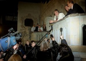Французский киноактер Жерар Депардье приехал на один день в российскую столицу для съемок в фильме режиссера Владимира Меньшова «Круженье сердца». Депардье согласился пообщаться с прессой в перерыве между съемками в одном из павильонов киностудии «Мосфильм». На фото: во время пресс-конференции. 2000 год.