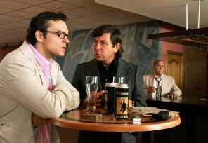 На фото: актеры Владимир Епифанцев (Вавилен Татарский), Андрей Фомин (Морковин) и Владимир Меньшов (Фарсук Фарсейкин) (слева направо) в сцене из фильма режиссера Виктора Гинзбурга «Generation П» по одноименному роману Виктора Пелевина. 2011 год.