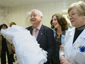 На фото: руководитель МХАТ имени Чехова Олег Табаков и его супруга актриса Марина Зудина с новорожденной дочерью Марией перед выпиской из Центра матери и ребенка. 2006 год.