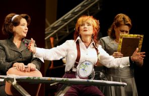 На фото: актрисы Лариса Голубкина в роли Дорис, Вера Алентова в роли Люсиль, Мария Аронова в роли Иды (слева направо) в сцене из спектакля Романа Козака «Девичник Club», предпремьерный показ которого прошел в театре им. А.С. Пушкина, 2006 год.