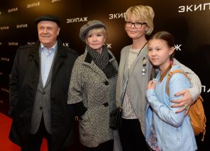 На фото: режиссер Владимир Меньшов, его супруга, актриса Вера Алентова, его дочь, актриса Юлия Меньшова с дочерью Таисией Гординой (слева направо) перед началом премьеры фильма «Экипаж» режиссера Николая Лебедева в кинотеатре КАРО «Октябрь», 2016 год.