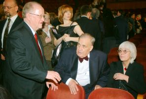 На фото: председатель Совета директоров ОАО «НК ЮКОС» Виктор Геращенко и президент российской академии кинематографических искусств режиссер Эльдар Рязанов с супругой Эммой (слева направо) после XIX церемонии вручения кинематографической премии «Ника», которая прошла в Центральном академическом театре Российской армии, 2006 год. Цитата от Виктора Геращенко: «Ну, США же сейчас полностью в… если б не девушки, сказал бы, где».