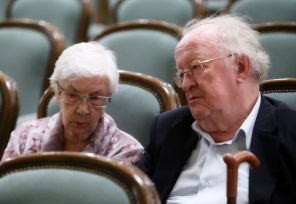 На фото: бывший глава Центробанка РФ Виктор Геращенко с супругой Ниной в зрительном зале ГАБТ перед началом празднования 80-летия балерины Натальи Касаткиной, Москва, 2014 год.