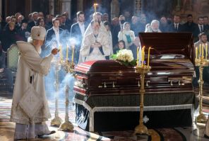 Утром в храме Христа Спасителя состоялось заупокойное богослужение, чин отпевания совершил патриарх Московский и всея Руси Кирилл. Присутствовавший на церемонии временно исполняющий обязанности руководителя фракции ЛДПР Леонид Слуцкий сообщил, что предстоятель Русской православной церкви сам выразил желание лично провести отпевание политика.