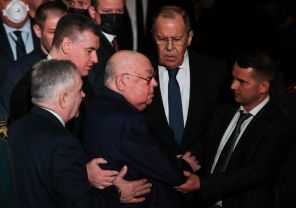На фото: временно исполняющий обязанности руководителя фракции ЛДПР Леонид Слуцкий, депутат Госдумы РФ Владимир Ресин и министр иностранных дел РФ Сергей Лавров (в центре слева направо) на церемонии прощания с лидером ЛДПР Владимиром Жириновским в Колонном зале Дома Союзов.