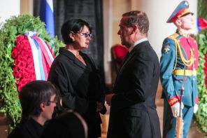На фото: заместитель председателя Совета безопасности РФ Дмитрий Медведев беседует с дочерью Лебедева на церемонии прощания с председателем Верховного суда РФ Вячеславом Лебедевым в колонном зале Дома Союзов.