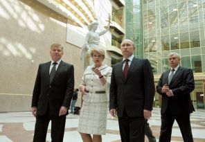 На фото: председатель Верховного суда РФ Вячеслав Лебедев (слева), президент РФ Владимир Путин (справа на первом плане) и губернатор Санкт-Петербурга Георгий Полтавченко (справа на втором плане) во время посещения нового здания городского суда, 2012 год.