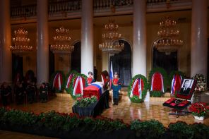 На церемонию прощания с председателем ВС РФ, проходившей в Колонном зале Дома Союзов в Москве, прошли сотни горожан. Вдоль зала на полу был установлен специальный постамент, на который все желающие могли возложить цветы. Постамент был полностью усыпан красными гвоздиками и розами. Позади — множество венков от государственных деятелей и организаций.