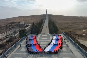На фото: логотип выборов президента РФ в виде латинской буквы V, составленный из флагов России и Донецкой Народной Республики на Саур-могиле, ДНР. В флешмобе, посвященном выборам президента РФ, приняли участие 200 человек.