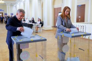 На фото: глава Татарстана Рустам Минниханов с супругой Гульсиной во время голосования на выборах президента России на избирательном участке в Казани, Республика Татарстан.