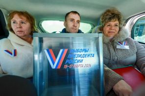На фото: члены избирательной комиссии в автомобиле во время выездного голосования на выборах президента России на дому, Иваново, Россия.