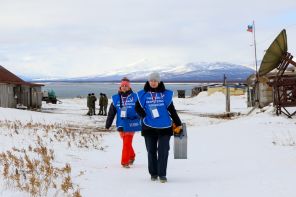 Россия. Камчатский край. Сотрудники выездной группы во время досрочного голосования на выборах президента РФ на заставе на мысе Желтый. Выездная избирательная комиссия совершила полет на юг полуострова для проведения голосования на четырех мысах, где расположены метеостанции, маяки и заставы. В эти труднодоступные местности можно попасть либо морем в сезон навигации, либо на вертолете.