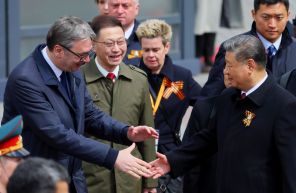 На фото: президент Сербии Александр Вучич (слева) пожимает руку председателю КНР Си Цзиньпину во время церемонии возложения венков к Могиле Неизвестного Солдата в Александровском саду после военного парада в честь Дня Победы в Москве.