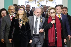 На фото: президент Бразилии Луис Инасиу Лула да Силва (в центре), его супруга Розангела да Силва (в центре слева) и президент Нового банка развития (НБР) Дилма Русеф (в центре справа) во время приема от имени президента РФ Владимира Путина для глав иностранных делегаций после парада, посвященного 80-летию Победы в Великой Отечественной войне.