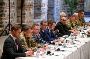 Украинская делегация во главе с министром обороны Украины Рустемом Умеровым встретилась утром сначала с турецкими и американскими коллегами, а затем с российской делегацией. Половина украинской делегации была одета в камуфляжную форму, сидя за широким белым столом прямо напротив своих российских коллег, которые были в костюмах, обращают внимание СМИ.