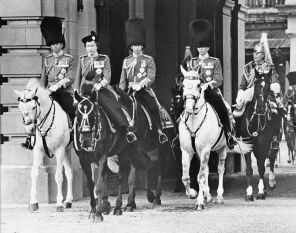 На фото: в форме шотландской гвардии королева Елизавета II, сидящая в дамском седле на 15-летней бирманской кобыле, покидает Букингемский дворец 11 июня 1977 года в Лондоне, чтобы принять парад на церемонии выноса знамени. Ее сопровождают слева направо: герцог Эдинбургский, полковник гренадерской гвардии; принц Чарльз, полковник валлийской гвардии, и герцог Кентский, полковник шотландской гвардии.