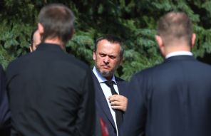 На фото: министр транспорта РФ Андрей Никитин прибыл для прощания с бывшим министром транспорта РФ Романом Старовойтом в ЦКБ № 1 Управления делами президента РФ.