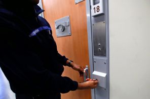 На фото: охранник в рубашке с надписью «Управление пенитенциарной системы» запирает камеру в тюрьме Ла-Сант.