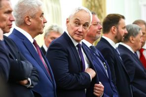 На фото: министр внутренних дел РФ Владимир Колокольцев и министр обороны РФ Андрей Белоусов (в центре слева направо) во время совместного заявления президента РФ Владимира Путина и премьер-министра Индии Нарендры Моди по итогам российско-индийских переговоров.