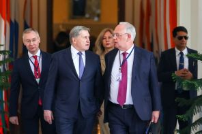 На фото: помощник президента РФ Юрий Ушаков и директор Федеральной службы по военно-техническому сотрудничеству Дмитрий Шугаев (слева направо на первом плане) перед началом российско-индийских переговоров.