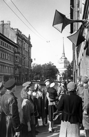 На фото: жители блокадного Ленинграда у громкоговорителя на Невском проспекте, слушающие сводки с фронта во время Великой Отечественной войны, 1943 год.
