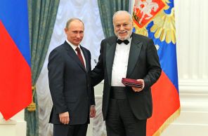 На фото: президент РФ Владимир Путин и певец Бедрос Киркоров (слева направо), награжденный почетным званием «Народный артист РФ», во время церемонии вручения государственных наград в Кремле, 2013 год.