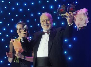 На фото: певец Бедрос Киркоров, получивший награды за Филиппа Киркорова в номинациях «Событие года» и «Певец года» на церемонии вручения ежегодной музыкальной премии «Звуковая Дорожка 2011» в концертном зале «Космос», Москва, 2011 год.