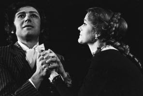 На фото: заслуженная артистка РСФСР Валентина Талызина в роли Юлии Тугиной, заслуженный артист РСФСР Геннадий Бортников в роли Вадима Григорьевича Дульчина в постановке комедии А.Н. Островского «Последняя жертва» на сцене Академического театра имени Моссовета. Постановщик спектакля — Герой Социалистического Труда, народный артист СССР Юрий Завадский, оформление заслуженного художника РСФСР А. Васильева, музыка композитора Ю. Буцко, 1973 год.
