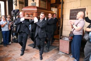 На фото: вынос гроба с телом кинорежиссера Александра Митты из Центрального дома литераторов.