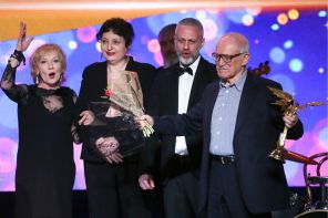 На фото: актриса Елена Коренева (слева), ставшая лауреатом в номинации «Лучшая женская роль второго плана» (фильм «Ее звали Муму»), режиссер Александр Митта, получивший специальный приз Совета Академии «За выдающийся вклад в отечественный кинематограф» имени Алексея Германа, и режиссер Павел Бардин (справа налево) и на юбилейной 30-й церемонии вручения наград национальной кинематографической премии «Ника» за 2016 год в Государственном академическом театре имени Моссовета.