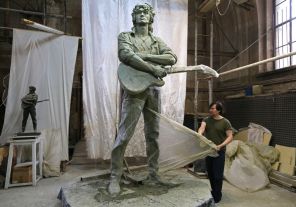 На фото: скульптор Матвей Макушкин у рабочей модели памятника рок-музыканту Виктору Цою в мастерской, Санкт-Петербург, 2015 год.