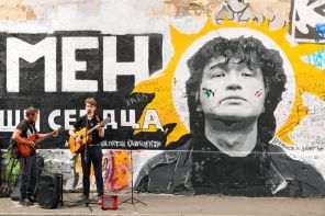 Впервые на телевидении Виктор Цой появился в 1981 или 1982 году как гость программы центрального телевидения «Монитор». Ведущий представил его талантливым резчиком по дереву. Действительно, Цою очень удавались японские фигурки нэцкэ. На фото: уличные музыканты у стены памяти Виктора Цоя на Арбате в Москве.