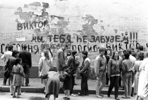 На фото: поклонники творчества Виктора Цоя у стены, посвященной памяти погибшего музыканта в Кривоарбатском переулке, Москва, 1990 год.