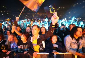 На фото: зрители во время большого концерта группы «Кино» в Ледовом дворце Санкт-Петербурга в честь 60-летия Виктора Цоя.