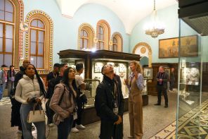 На фото: участники Международного музыкального конкурса «Интервидение» 2025, представляющие Венесуэлу, во время экскурсии в Историческом музее.