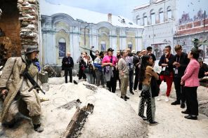 На фото: певец Мустафа Саад, представляющий Египет (третий справа), во время экскурсии в Музее Победы на Поклонной горе. Сергей Савостьянов/фотохост-агентство ТАСС для конкурса «Интервидение»