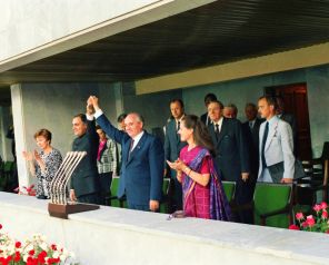 На фото: театрализованный праздник на Центральном стадионе в Лужниках, на котором присутствовали Генеральный секретарь ЦК КПСС Михаил Сергеевич Горбачев с супругой и премьер-министр Индии Раджив Ганди с супругой, 1987 год.
