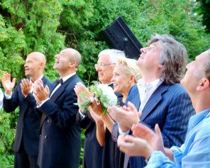 Композитор Юрий Чернавский и поэт-песенник Владимир Матецкий познакомились и начали сотрудничать в середине 1970-х годов, когда Чернавский искал либреттиста для своего нового музыкального проекта. Именно по предложению Чернавского Матецкий написал тексты песен для его первого альбома «Автопортрет», положив начало их долгому и плодотворному творческому союзу. На фото: актер и режиссер Федор Бондарчук, композиторы Игорь Крутой, Раймонд Паулс, певица Лайма Вайкуле, композитор Владимир Матецкий, певец Леонид Агутин (на снимке слева направо).
