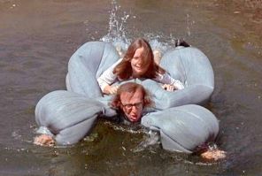 На фото: Вуди Аллен и Дайан Китон в сцене из фильма United Artists «Спящий». СЮЖЕТ: Мужчина, замороженный в 1973 году после рутинной операции, размораживается учёными 200 лет спустя в знак протеста против авторитарного государства.