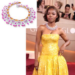 На фото: актриса и певица Райан Дестини дополнила свой потрясающий образ на церемонии вручения премии «Золотой глобус» ослепительными украшениями от Chopard. Она сочетала колье с 57,09 каратами бриллиантов и 73,70 каратами сапфиров с серьгами из 18-каратного белого золота, украшенными 4,05 каратами бриллиантов, — оба украшения из коллекции Haute Joaillerie. Она также выбрала кольцо из коллекции L’Heure du Diamant этого же ювелирного дома.