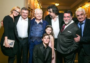 На фото: супруга А. Табакова Анжелика, ресторатор Антон Табаков, художественный руководитель МХТ имени А.П. Чехова Олег Табаков, актер Павел Табаков, дочь О. Табакова Мария, актер Игорь Золотовицкий, председатель наблюдательного совета группы компаний Bosco di Ciliegi Михаил Куснирович и президент НП «Объединение заводов ФИНПРОМКО» Анатолий Павлов (слева направо) на юбилейном вечере в честь 80-летия О. Табакова в МХТ имени А.П. Чехова, 2015 год.