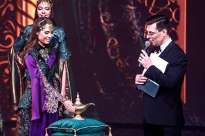 Интеллектуальный конкурс был оформлен в виде восточной притчи: девушки терли лампу Алладина, после чего на экране появлялись философские вопросы о свободе, любви и самореализации. Например такие: «Многие ориенталистские картины создавались художниками, которые никогда не были на Востоке. Может ли красота быть подлинной, если она создана воображением, а не реальностью?». На фото: участница Эльвина Гиниатуллина (на первом плане) во время финала XXVIII Республиканского конкурса красоты «Мисс Татарстан-2026» на сцене театра имени Галиасгара Камала.
