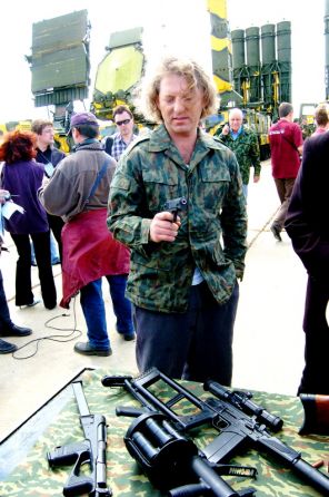 На фото: телепродюсер Александр Олейников на выставке вооружений.