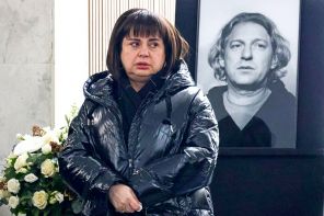 На фото: генеральный директор Фонда «Академия российского телевидения» Этери Левиева во время церемонии прощания с режиссером и телеведущим Александром Олейниковым в траурном зале Троекуровского кладбища.