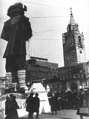 На фото: реклама мультипликационного фильма «Новый Гулливер» (на первом плане), здание газеты «Известия» и Центральный антирелигиозный музей Союза безбожников СССР в здании бывшего Страстного монастыря (слева направо на втором плане) на Пушкинской площади в Москве, 1935 год.
