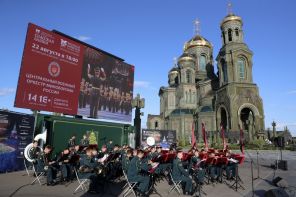 Впоследствии, во время подготовки проекта нового основного закона, МИД РФ выступил с инициативой изменить соотношение сторон флага с 1:2 на 2:3, а комитет по культуре Верховного Совета внес предложение заменить лазоревый и алый цвета флага на синий и красный, что соответствовало описанию государственной символики дореволюционной России. На фото: музыканты Центрального военного оркестра Министерства обороны РФ во время концерта программы «Военные оркестры в парках» на Соборной площади главного храма Вооруженных сил РФ.