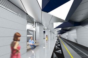 На фото: проект станции «Аэропорт Внуково» Солнцевской линии метро. Путевые стены украсили тематические рисунки, выполненные в технике цифровой печати на алюминиевых сотовых панелях: десятки самолетов как бы летят над картой России, а в верхней части платформы изображены авиаконструкторы — их создатели.
